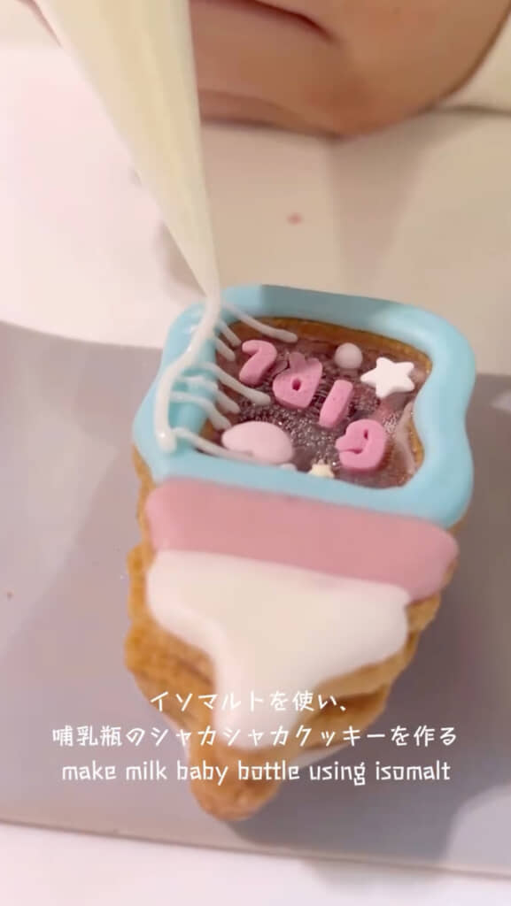そして、イソマルト(甘味料)を使った哺乳瓶のシャカシャカクッキーを作り、最後に「Boy or Girl?」と書かれたケーキトッパーを飾ったら……キュートなジェンダーリビールケーキが完成です!