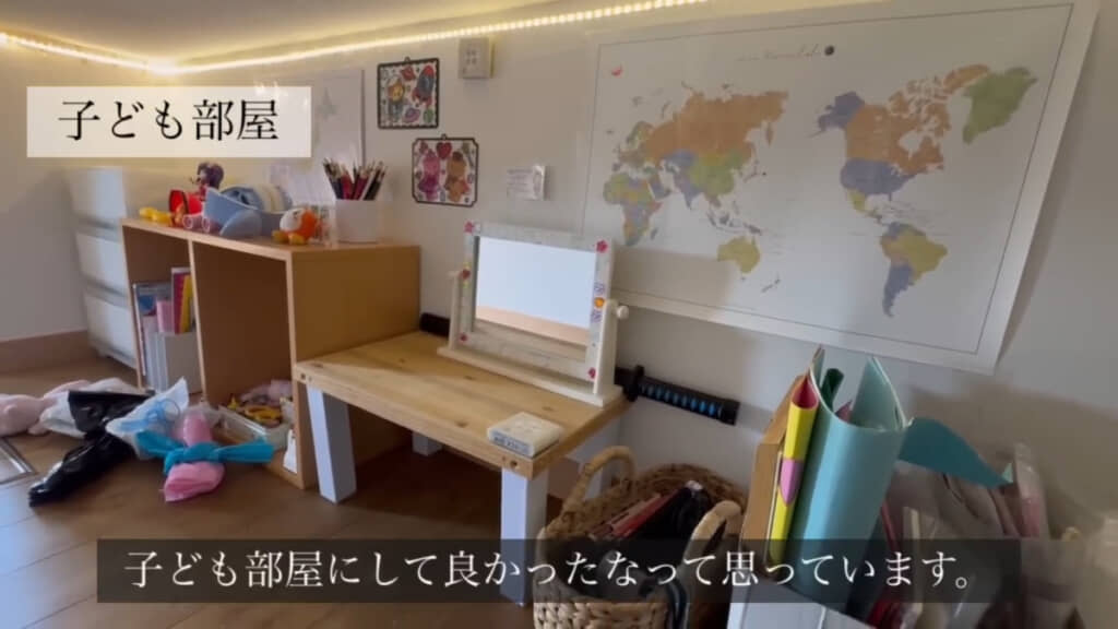 友達と遊ぶときもリビングではなく、わざわざここで遊ぶくらい気に入っているようです。照明は電池式のテープライトを使用
