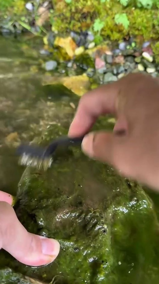さらに壁や岩、流木などについたアオミドロをブラシでゴシゴシこすります。かなりハードな作業が続きますが、一体どれくらいキレイになったのでしょうか。