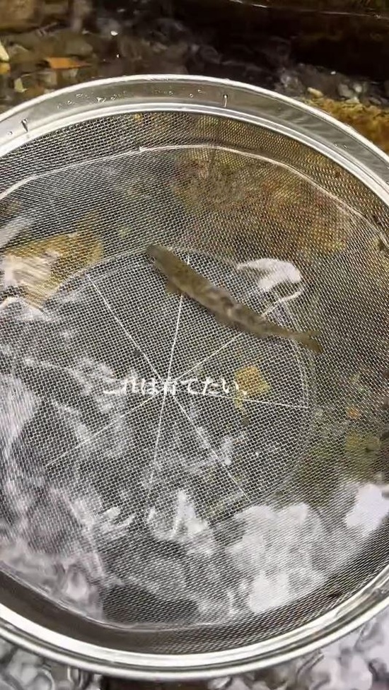 水を入れ替えた後は、ビオトープの“新メンバー”を迎えるため近所の川へ。そこで板取さんは新鮮なアマゴをゲットしました。「これは育てたい、かわいい!」と興奮気味にコメントしています。