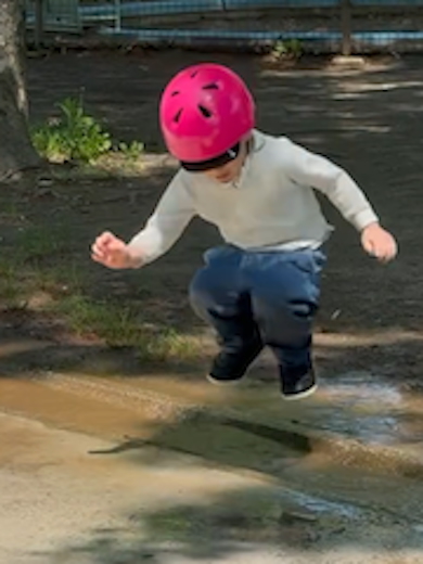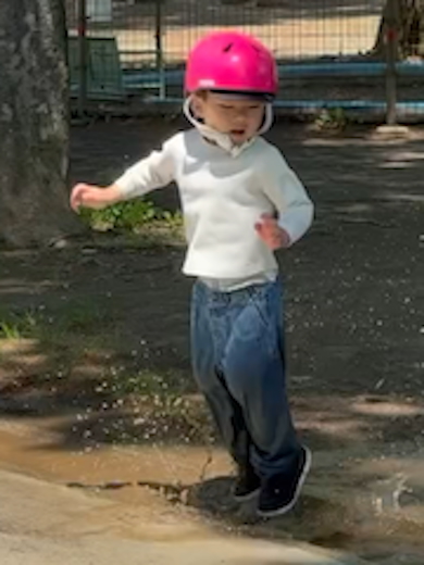 白の上着を着た息子くんは、土で濁った水たまりの近くで元気よく飛び跳ねており、足元では水しぶきが上がっていました。
