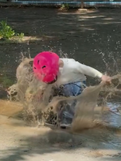 着地直後、ひときわ大きな水しぶきが上がり、息子くんの顔面を含む全身にバシャリ。さらに、バランスを崩してそのまま水たまりの上に尻もちをついてしまいました。Oh……!