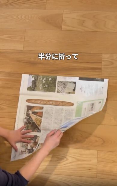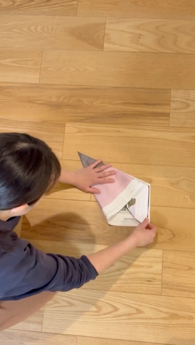 海外のSNSアカウントが折り紙で傘を作っているのを見かけて、大きな傘を作りたくなったというairiさん。まずは、新聞紙を正方形にカットするところからスタートです。