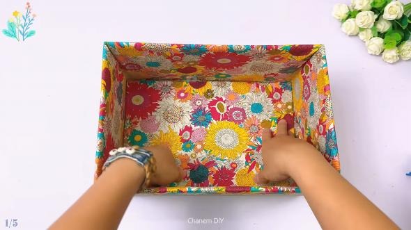 次に、花柄の布を用意してダンボールの内側に貼り付け。無機質だったダンボールが、一気に明るく華やかな印象に変わっていきます。