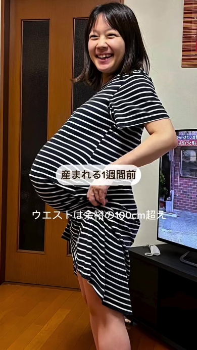 そして出産の一週間前、yasukaさんのおなかははちきれんばかりの大きさに。体重は妊娠前と比べて20キロ増加し、ウエスト周りは優に100センチを超えていました。