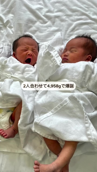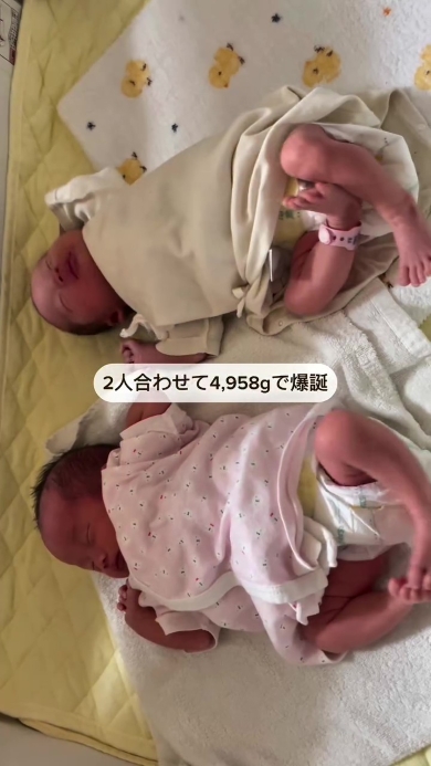 そしていよいよ出産。産まれてきた赤ちゃんは、2人合わせてなんと4958グラム! 双子ちゃんはママのおなかの中ですくすくと育って産まれ、どちらも元気いっぱいの様子です。仲良く並んで寝ている姿がかわいらしいですね。