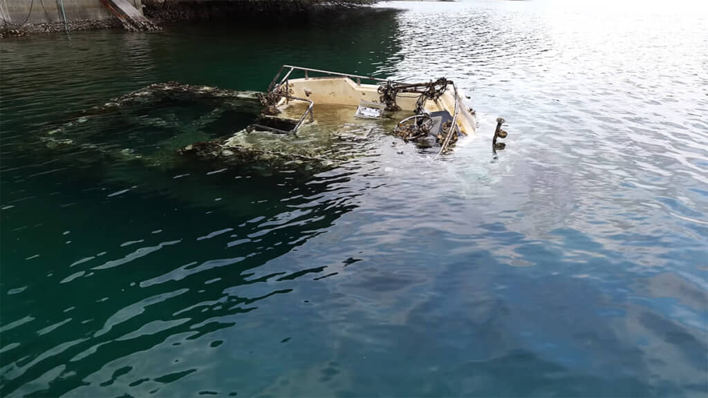 そして夕方には、再びカニカゴを引き上げにいくことにします。残念ながら1~3カ所目には何も入っていませんでしたが、「カニカゴを仕掛けるときはカゴの向きに注意すること」を学びつつ、沈没船に向かいました。