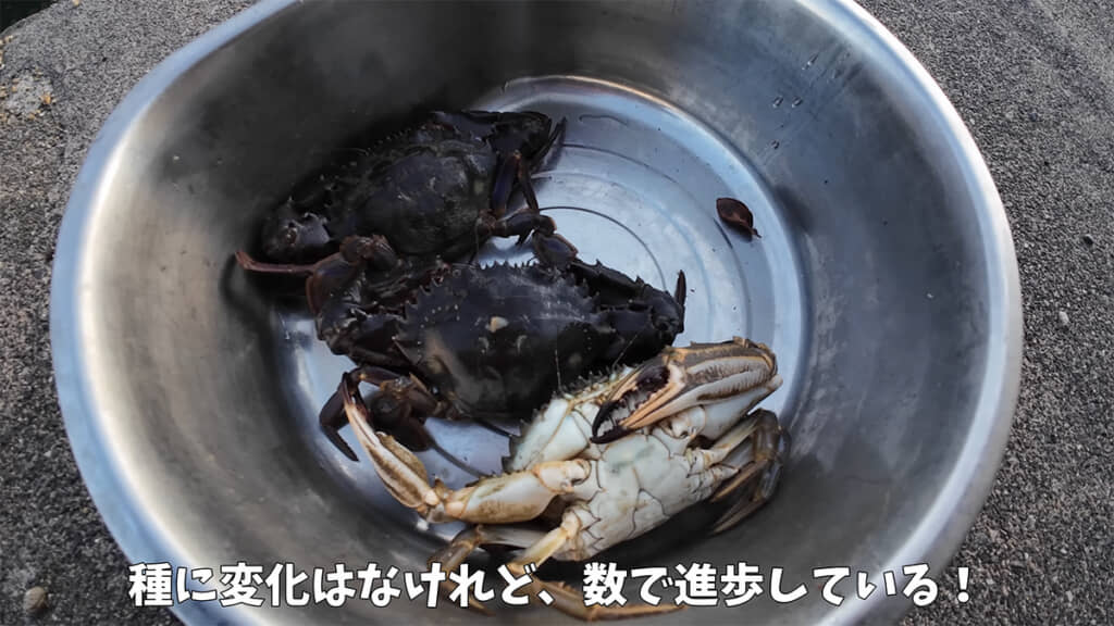 調べてみたところ、イシガニは育った環境やエサによって色が変わるらしいとのこと。このカニは、イシガニと考えてよさそうです。