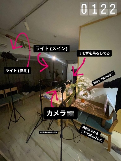 柔らかい陽射しを作るため、メインのライトは遠くから手前に照らすように設置。そして、もう少し近い位置に影用のライトを置いています。さらに、テーブルの高さを補うためにイスで底上げ。