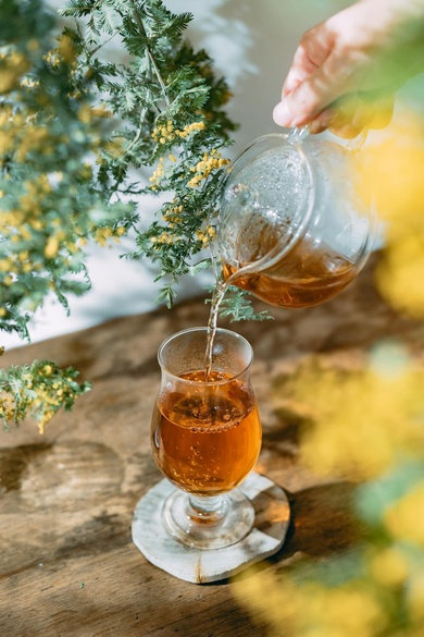 背景となる壁の手前には、良い感じにミモザを複数の位置からつるすことで、生い茂っている様子を再現。さらに、うまく手先だけが写り込むように、手を伸ばしながら頑張って紅茶を注いでいる様子も収められています。努力がにじむ現場……!