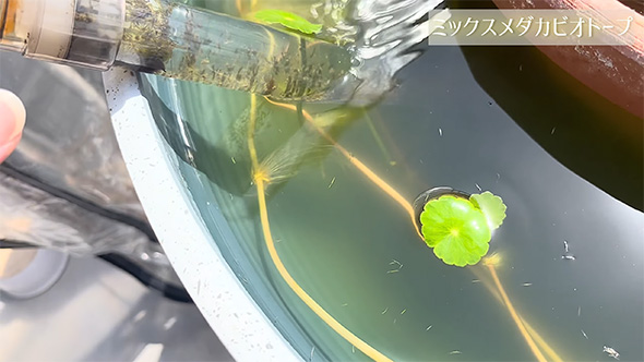 いろんな発見があることを楽しみつつ次々と容器をリセットしていくと、「ミックスメダカビオトープ」で卵を持ったメダカを発見。最後の「小町」の容器をチェックするとみんな元気で、弱っている個体もいませんでした。