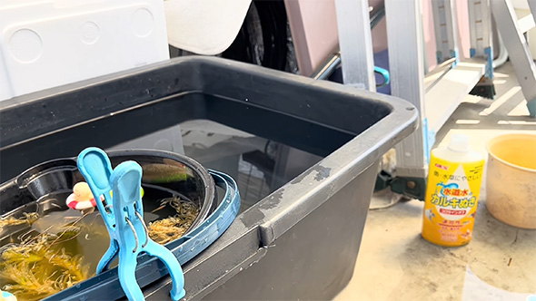 翌日は植物ラックをビニールハウスに入れるために、中にあるメダカの容器を移動。さらに翌日にはメダカの容器をビニールハウスの外に出して、使っていない水槽や容器を洗ったり、メダカを移動させたりとさまざまな作業を行うことに。