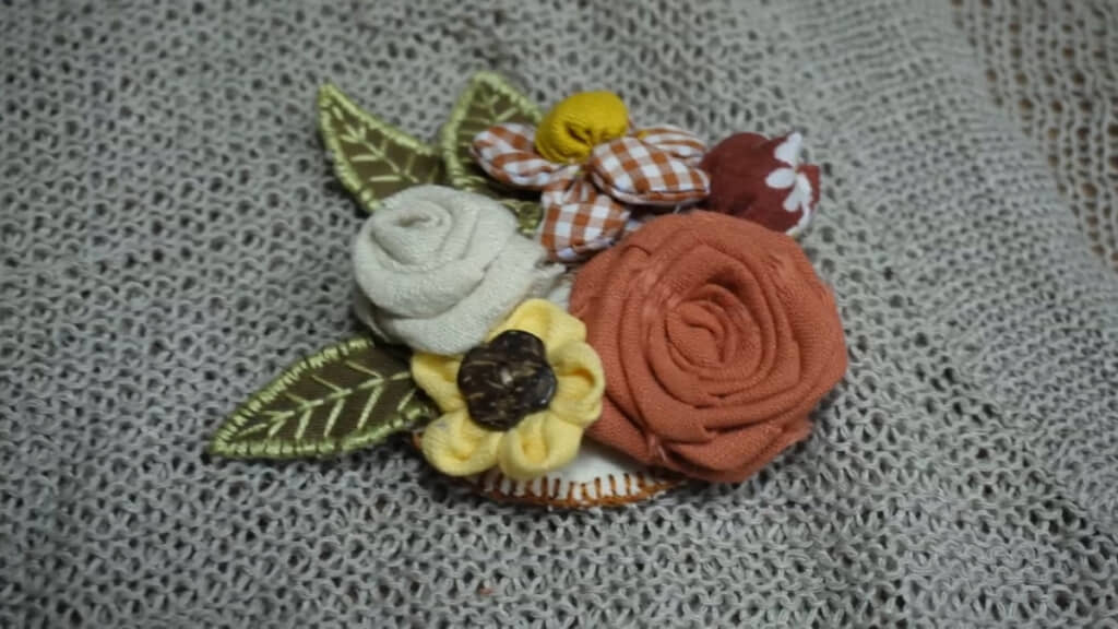 5種類のお花が並ぶブーケのようなブローチがすてき