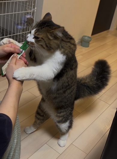猫が大好きなオヤツを食べるとなぜか…… 目を疑う姿への変身に「ニンゲンのわし嫉妬」「尻尾までムキムキすぎて」