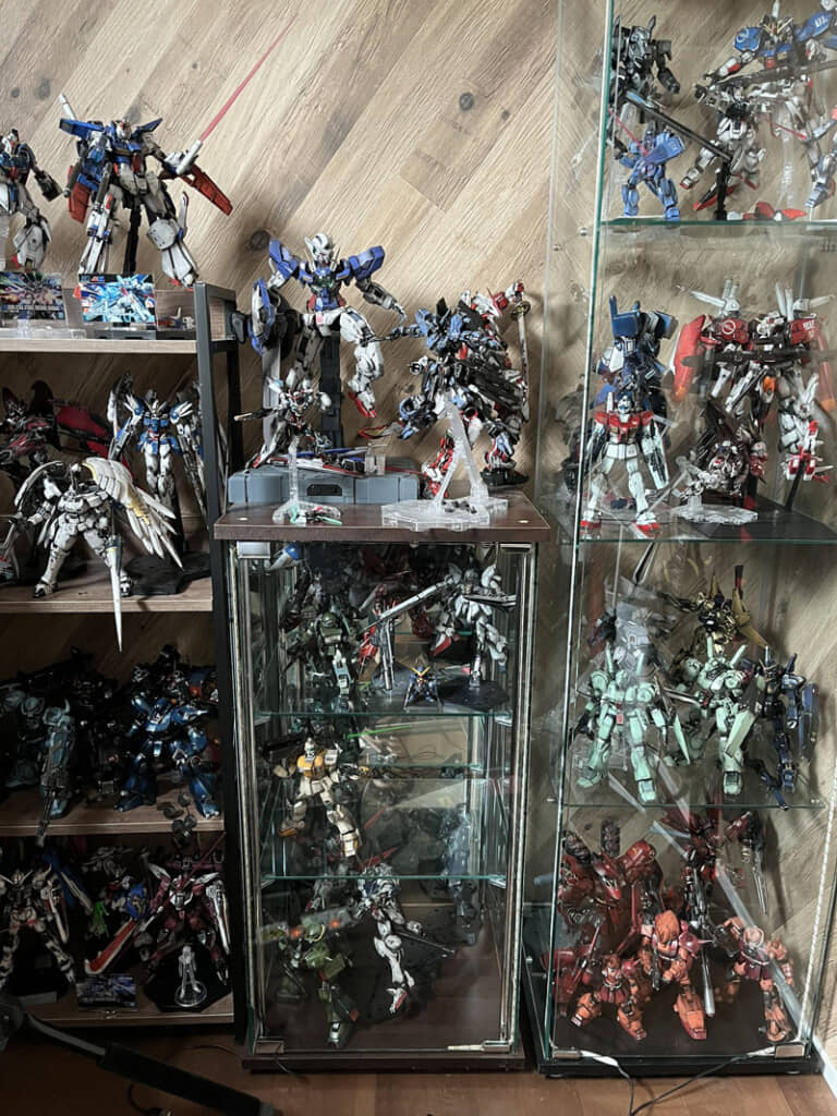 その主張にたがわず、棚は大量のガンプラがぎっしり。今となっては入手困難なキットの姿もみられます。