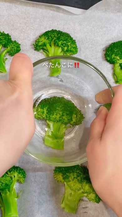 ブロッコリーをぺたんこにつぶしてしまう、思い切りの良いアイデア料理がInstagramで注目を集めています。記事執筆時点で230万再生を突破。