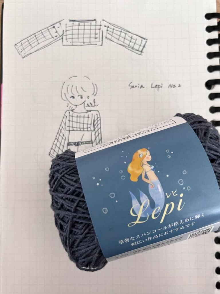 編む前のデザイン画とセリアの毛糸「Lepi(レピ)」