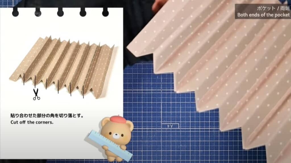 ポケットの底のパーツを作ります。15×28センチのデザインペーパーを用意し、両端のパーツと同様に折り目を作り、両面テープを貼っていきます。貼り合わせた部分の両サイドの角を切り落とします。