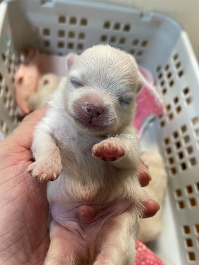 パピー期のとろろくんは、飼い主さんの手のひらサイズの小ささ。まだ目が開いていないようで、前足を少し伸ばしながら眠っていました。尊すぎる……。