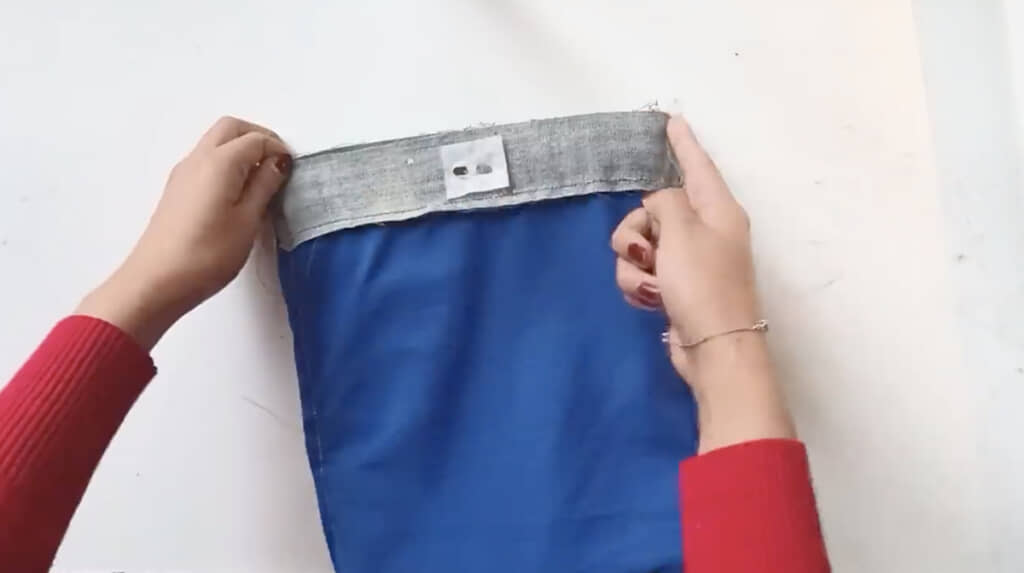 ブルーの裏地を縫い付けて袋状に