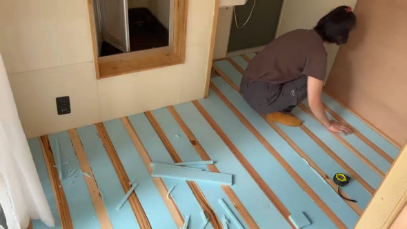 今回は、以前の動画で室内に作った壁によってできた空間をアップデート。まずは下地のままだった床に、床板を支える根太(ねだ)を組むところから作業開始です。