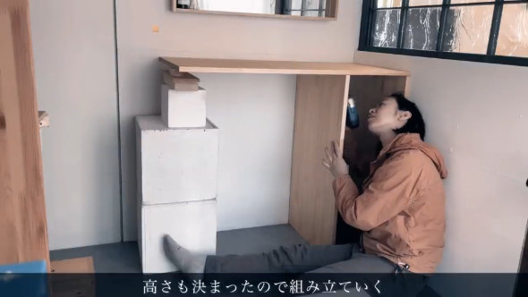 次に洗面台を作ります。これまで考えたこともなかったという洗面台の高さは、せっかくなので自分に合わせてカスタマイズ。また、「小指をぶつけそう」という理由で左側の脚はなくし、170キログラムまで耐えられる棚受けを2個取り付けて設置することに。空間と好みに合わせる、DIYならではのデザインがワクワクしますね!