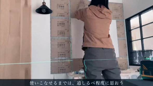 さらに洗面スペースのDIYの後編動画では、水はね対策で鏡の周りにタイルを貼っていく様子も見ることができます。30センチ角のシートを14枚購入し、接着剤を薄く均一に塗るのに苦戦しながらも進め、墨出し器も使いながらタイルを貼っています。