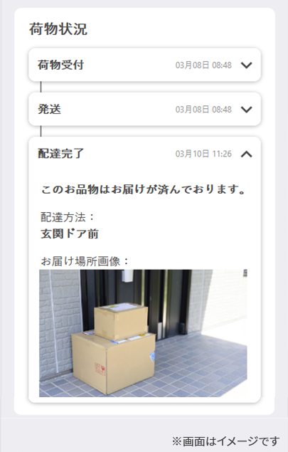 ヤマト運輸ではクロネコメンバーズ会員向けに、置き配サービスを提供しています。配達完了の際は、玄関前など指定された場所に荷物を置いて撮影し、メールで通知。荷物が届いた現場の状況を、利用者が写真で確認できる仕組みです。