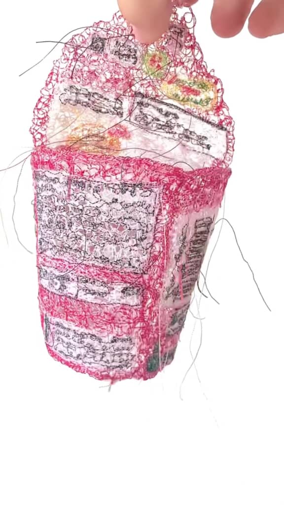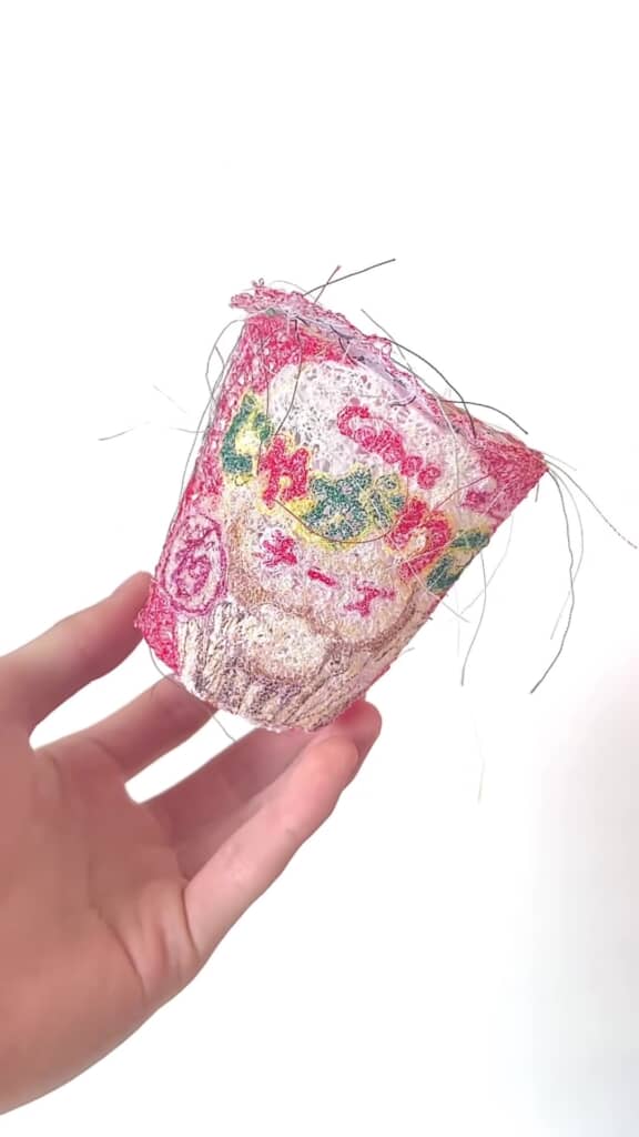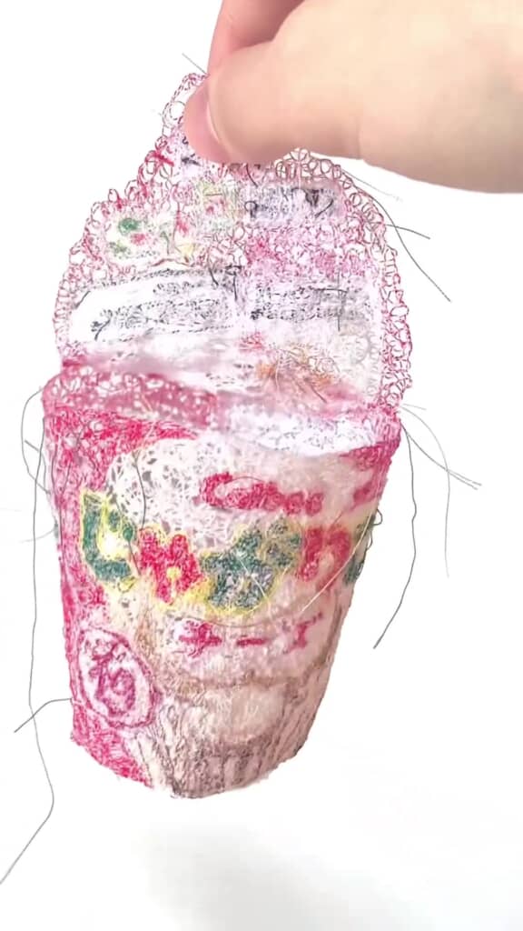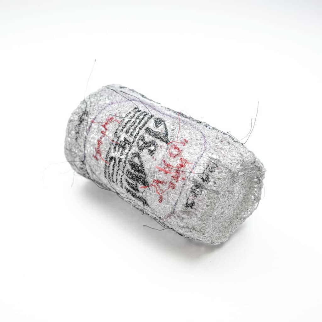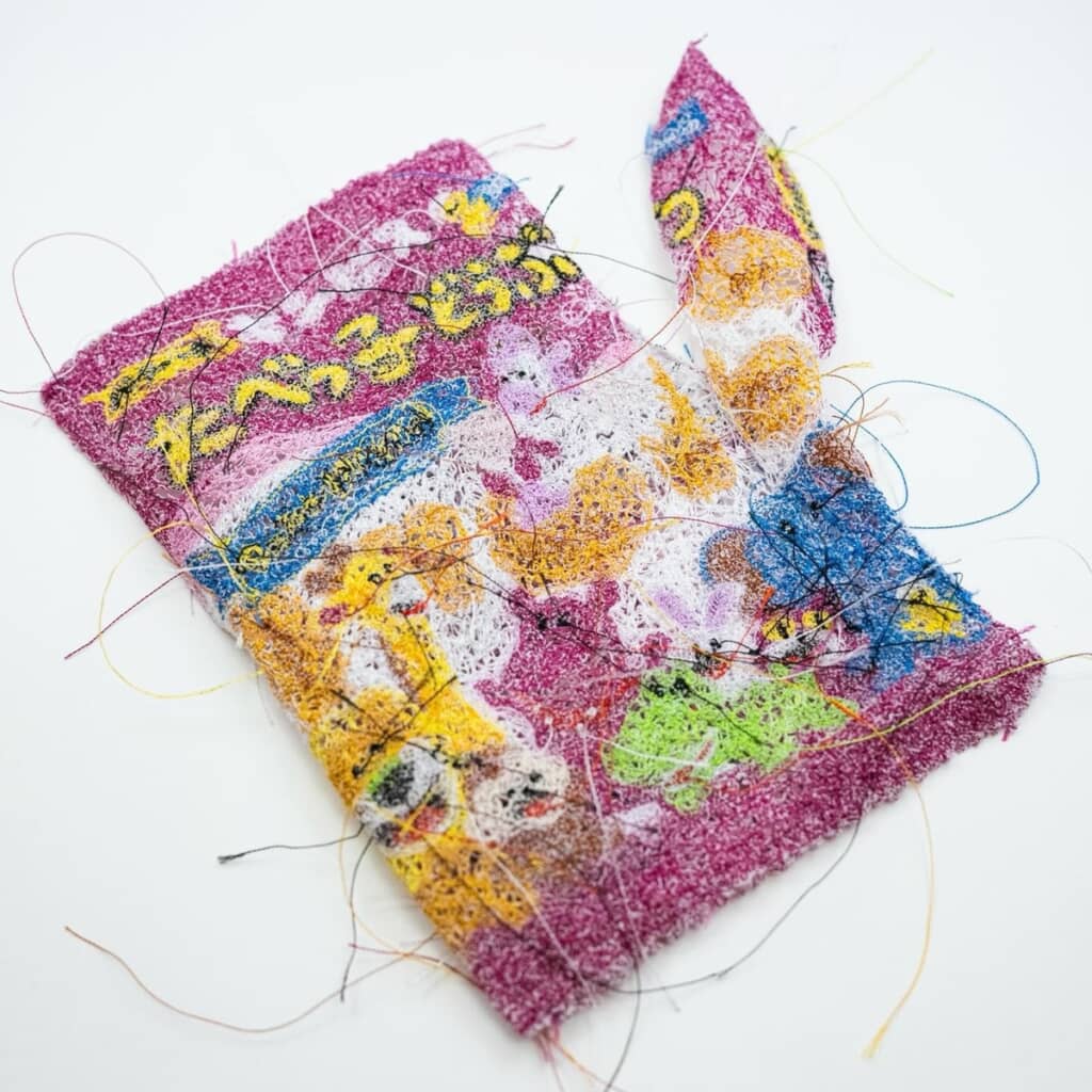 菅野さんの公式サイトによると、「消費のために設計され、制度の中で役目を終えた包装やラベル、生活に残る痕跡、あるいは、もう名前すら持たない記憶の断片を、刺繍(ししゅう)によって縫いとめる作品」を制作しているとのこと。また、「支えを失ったあとの記憶にかたちを与えるように、糸だけを残している」と説明しています。