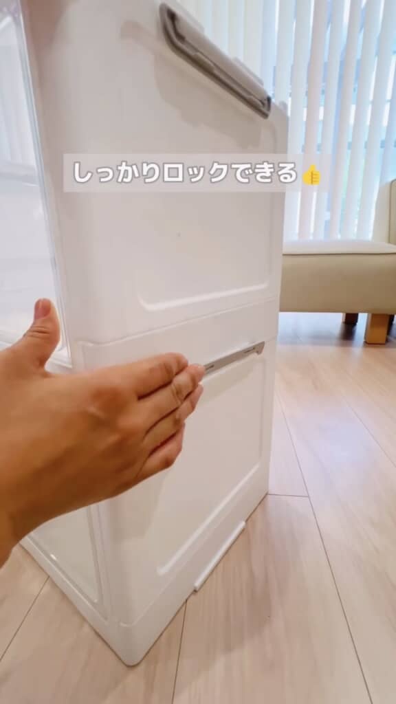 マグネット式の扉と内側ロック付きで、簡単に組み立てられるケース。積み重ねての使用もでき、その場合はロックをかけることでしっかり安定させられます。