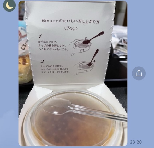 パッケージを開けると書かれている「BRULEEのおいしい召し上がり方」の写真を送ってきた友人。おいしい食べ方の1つ目として、「まずはコツコツ。カップの横を押して少しへこむぐらいが食べごろ」と書かれていますが……。
