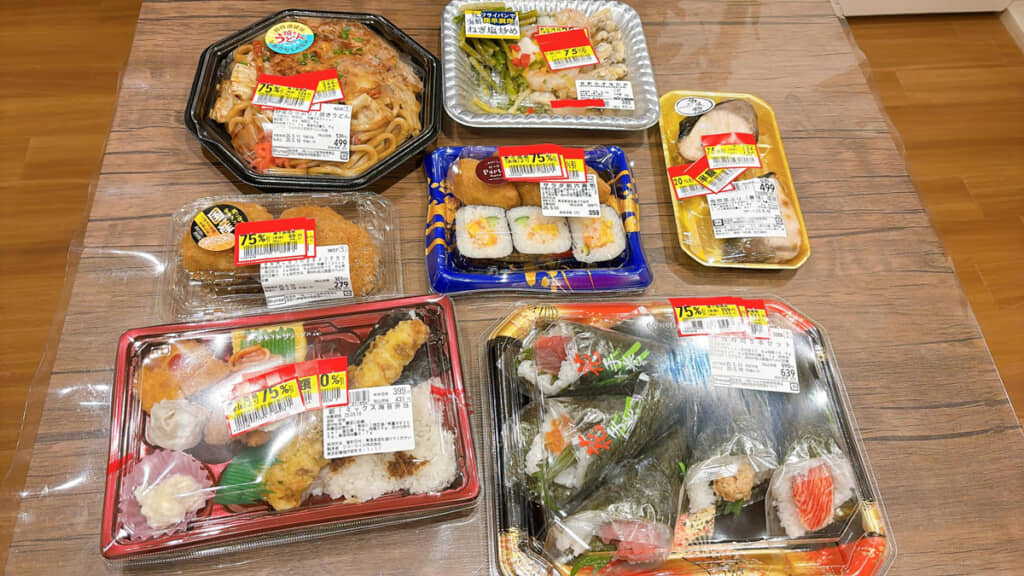 埼玉県や群馬県を中心に、関東地方に展開するスーパーマッケットチェーン「ベルク」。写っている商品は、手巻き寿司5本セットやミックスのり弁当、焼きうどんなど種類はさまざまですが、その全てに75%割引のシールが貼ってあります。