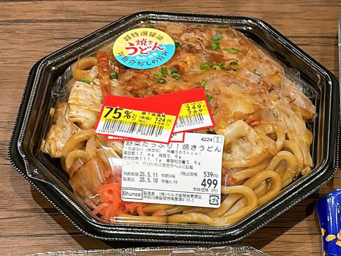 例えば、本来539円の焼きうどんが134円に割引されています。これ1つで400円以上も浮いています。また75%割引シールの下には、半額シールや20%割引シールが貼ってあることから、複数回割引され、閉店間際には驚異的な割引率になったことが分かります。あまりにもお得すぎる……!