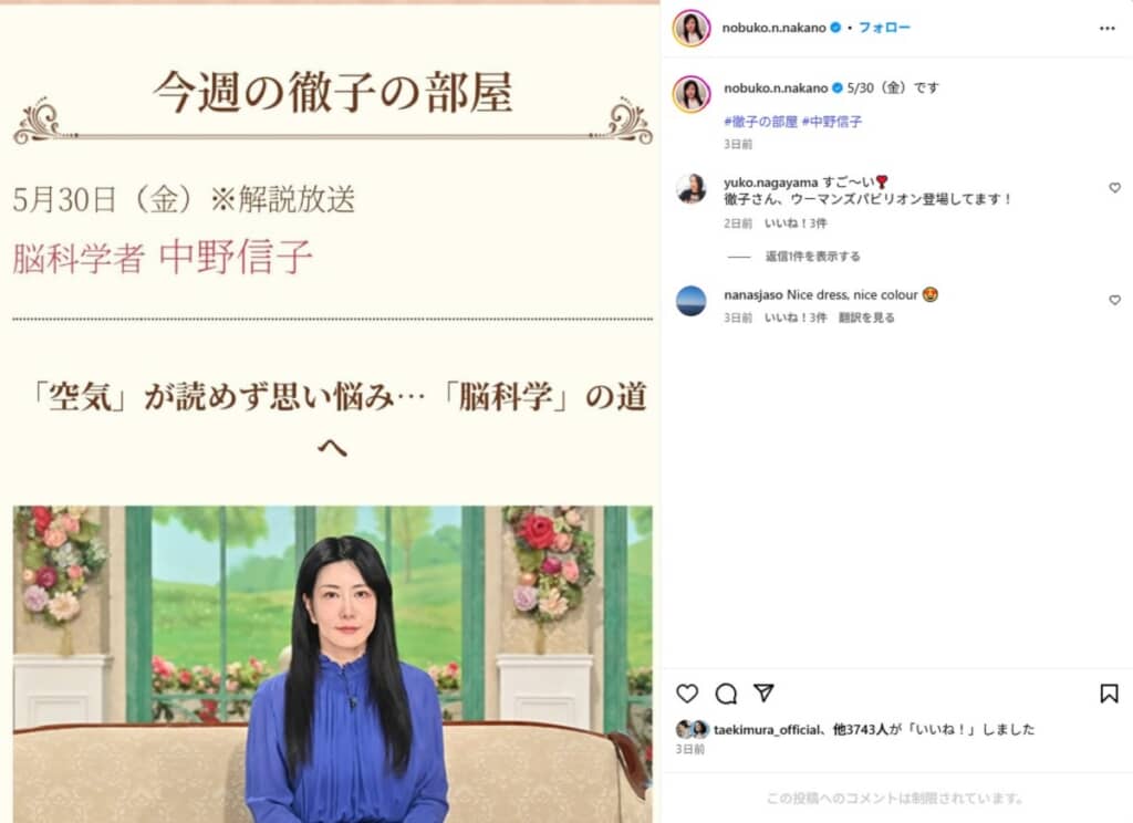 番組出演時の中野さん(画像は中野信子Instagramから)