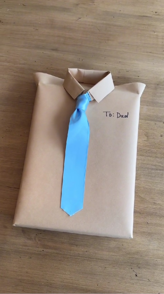 ラッピングペーパーやリボンの素材や色味によって雰囲気が変わるため、白でシンプルに仕上げたり、柄付きで少し遊んでみたりと、アレンジは自在。よくスーツを着るお父さんであれば、好みに合わせたラッピングにすると、さらに喜んでもらえそうですね。特別な道具は不要なので、お子さんもチャレンジしやすそうです。