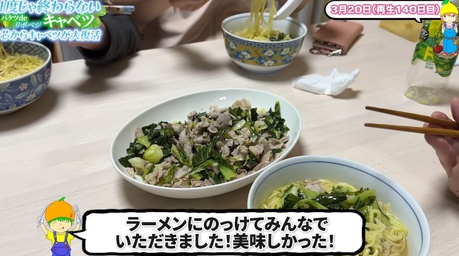 収穫したキャベツは豚肉と炒め、ラーメンのトッピングにして食べたみかんぼーやさん。生でも甘味があり、「ちゃんとキャベツになってました」と驚いていました。