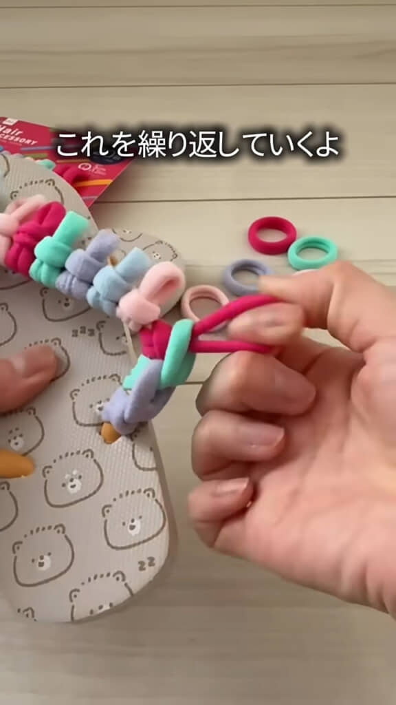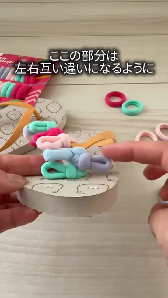 使用するのは、ダイソーの「洗えるヘアゴム」。鼻緒の端から、ゴムをリング上になるように結んでいきます。真ん中の部分は左右互い違いになるように2つのゴムを付けましょう。色の順番を考えて、自分好みの見た目にするのも楽しいですね。