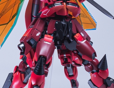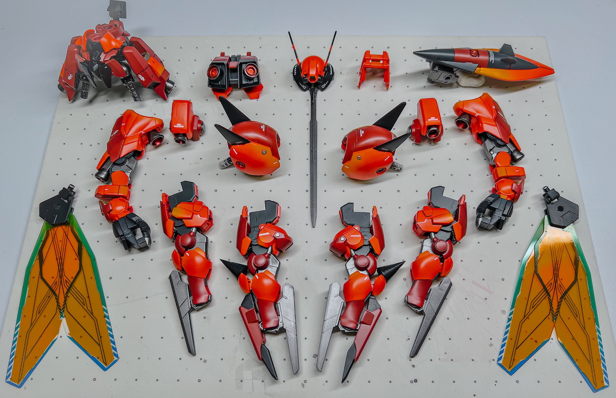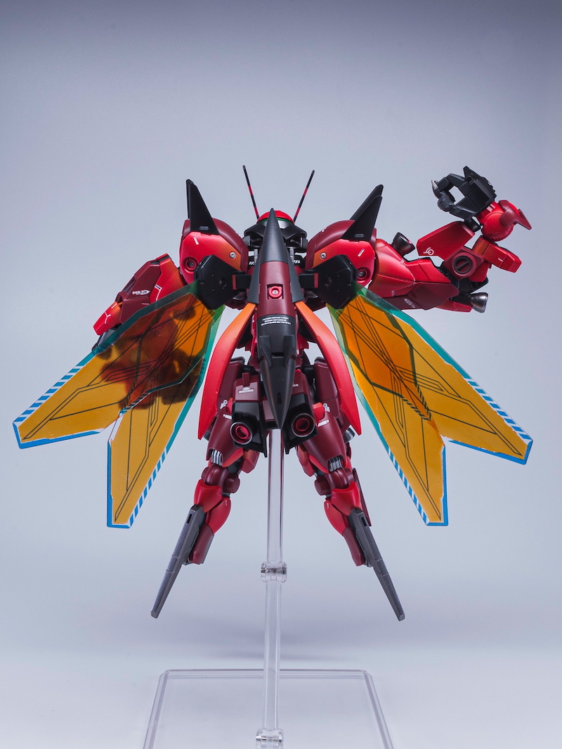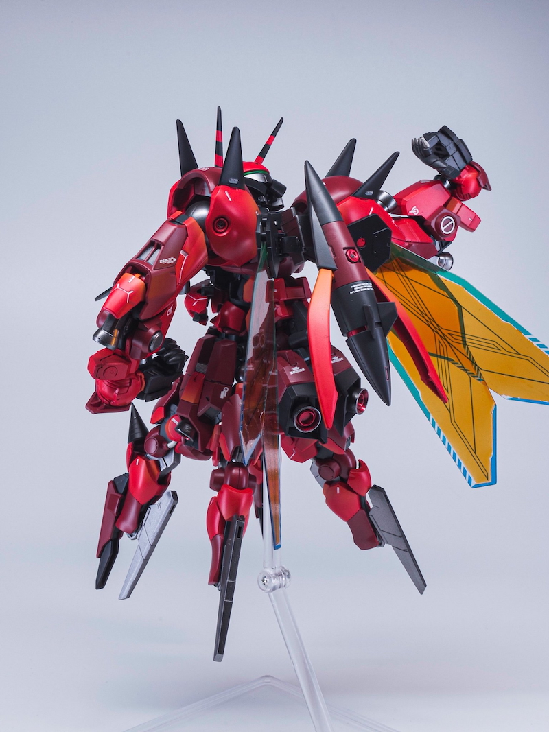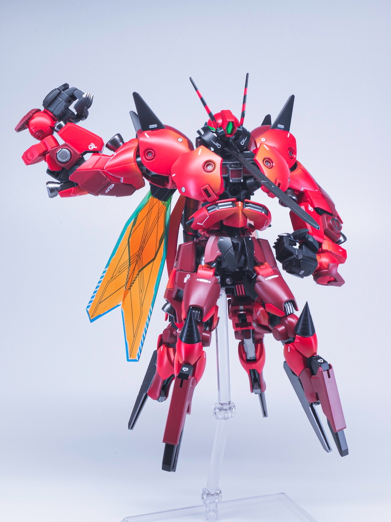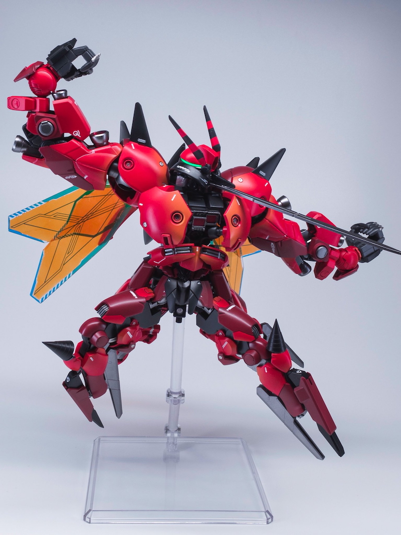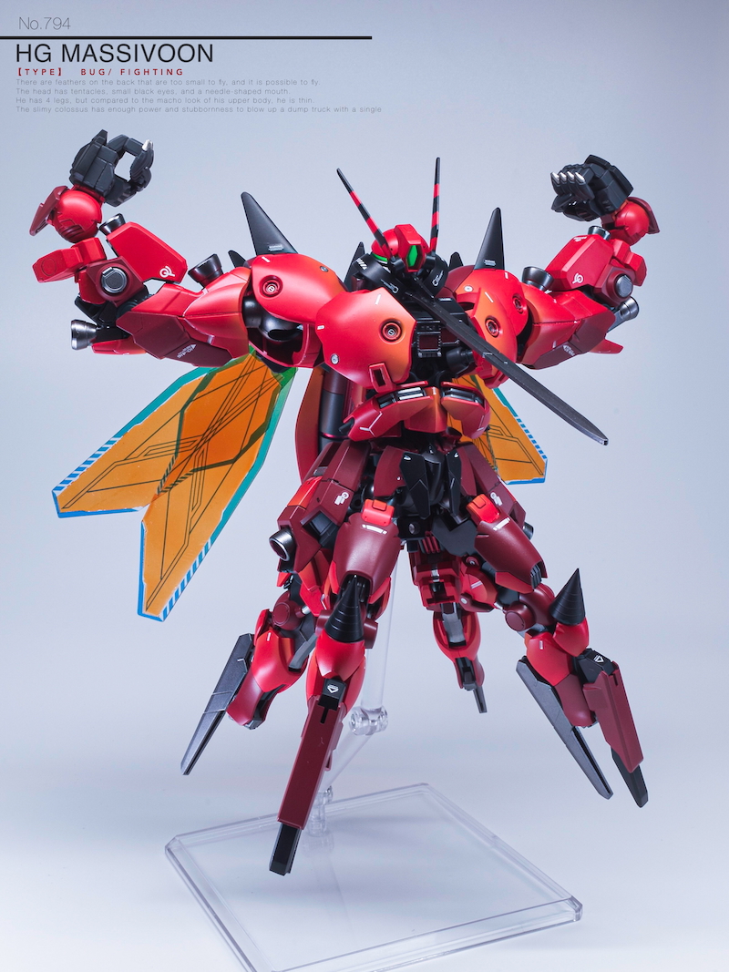 ボディビルダーのようなポージングをキメたHGマッシブーンは、ムキムキな腕や4本の尖った足、蚊のような頭部や羽を、ガンプラのパーツの組み合わせで見事に再現。