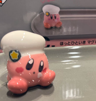 こちらはピンクのカップと細長いプレート(トレー)のセット。店員姿のカービィもついてくるのですが、どこか様子がおかしいです。彩色のズレで、顔がゆがんでしまっている……!?