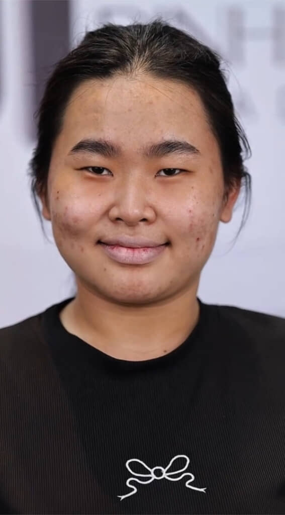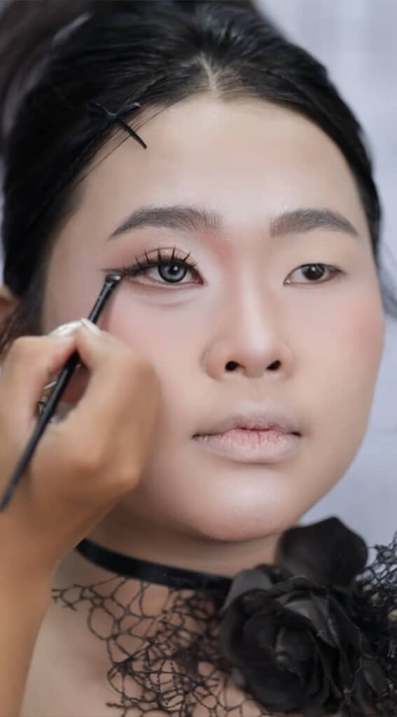 眉を整え、ベースメイクを施すと、さっそく印象が変わります。チークを入れるとより自然な肌の質感になり、さらにアイメイクでガラリと変化。違和感なく二重を作り、加えてつけまつげを付け、眉も描いて、カラーコンタクトレンズを入れたら……?