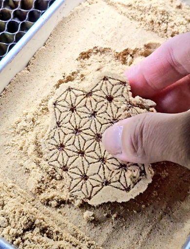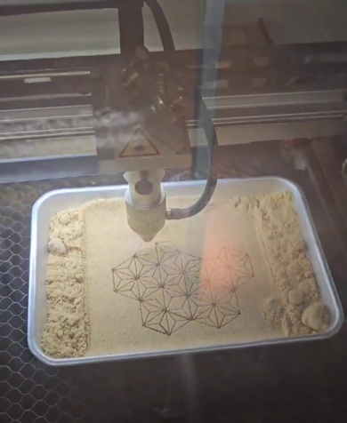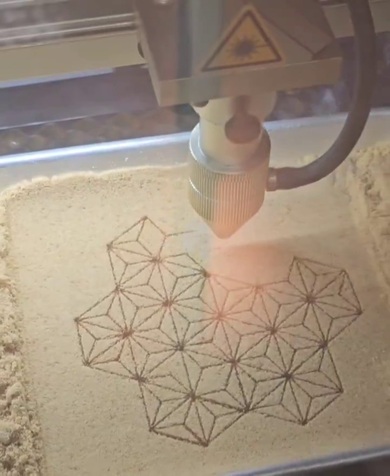 鹿児島・奄美大島の特産として売られている黒糖を装置内にセットしたら作業開始。レーザー光を照射し、事前に決めておいた幾何学模様をトレイの中の黒糖にどんどん描いていきます。