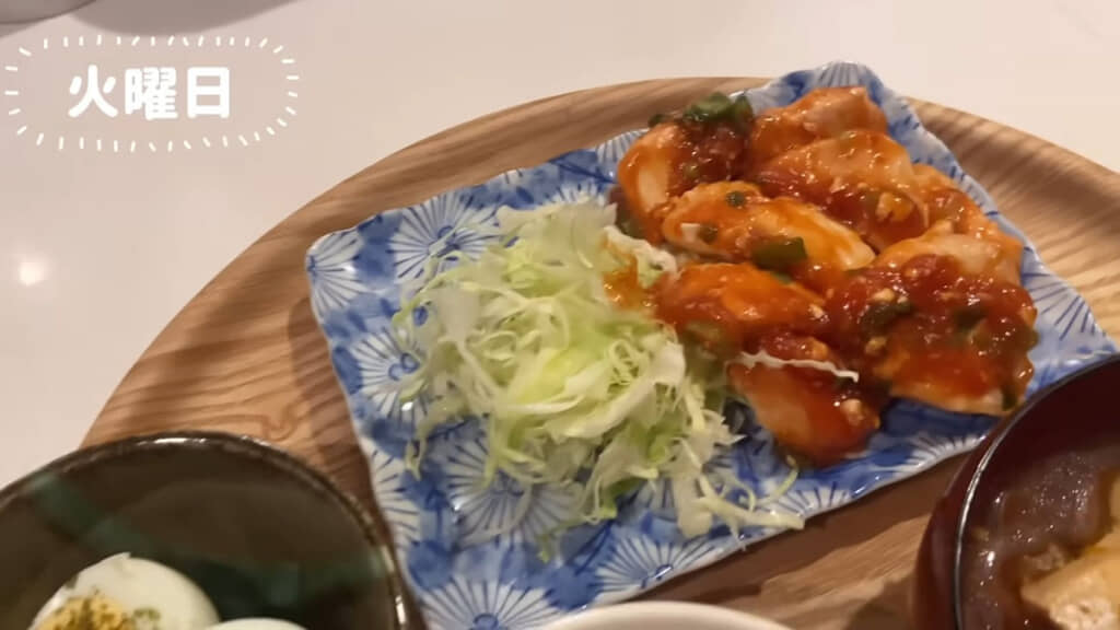 火曜日は鶏むねで「鶏チリ」。こちらもワンパン料理です。鶏むね肉は朝のうちに調味液に漬け込んでおけば、やわらかくふんわりに。片栗粉をまぶし、フライパンでじっくり焼き、調味料を絡ませればできあがり。まだ気力のある火曜日ならではのひと手間を加えたメニューです。