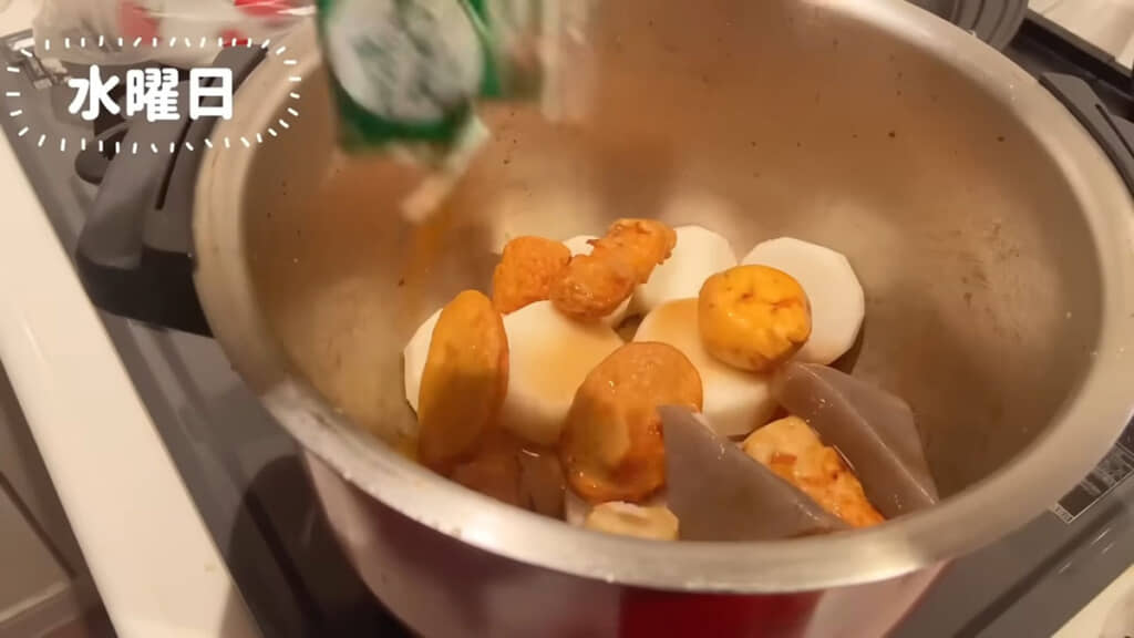 水曜日は「カレイの煮付け」と「おでん」。魚料理は意外と簡単で、カレイはフライパンで煮るだけです。煮ている間に、ホットクックでおでんを準備します。おでんセットの付属のつゆで煮込むだけなので手間いらず。簡単にもう一品が完成します。