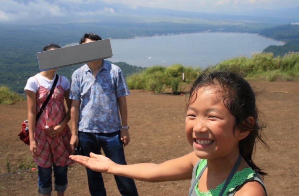 さらに2枚目の写真では、もはや後ろにいる人々に手のひらが被さらないところへポジション取りをしてしまい、完全なるガイド役に。屈託のない純真無垢な笑顔が、まぶしいですね……。