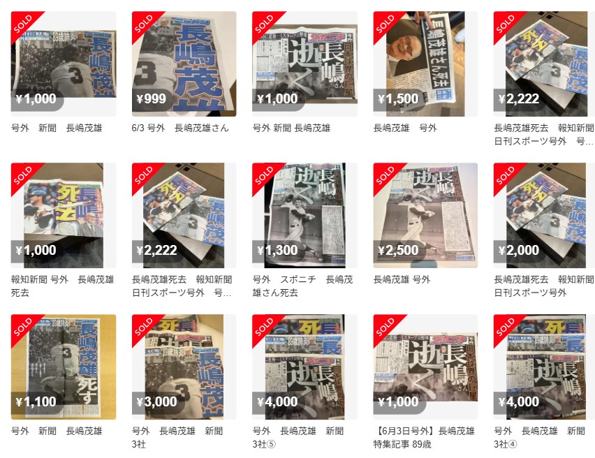 6月3日に89歳で亡くなった、プロ野球・読売ジャイアンツ(以下、巨人)の長嶋茂雄終身名誉監督の訃報を伝える号外がフリマサービス上で高額転売されています。