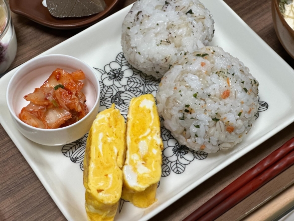 白い皿には、混ぜごはんで作った大きなおにぎりが2つと卵焼き2切れ。そのそばには、丸い小皿に入ったキムチがありました。