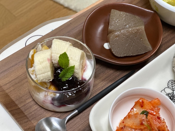 茶色の葉っぱのような形の小鉢には、こんにゃくの煮物が入っています。その左側の容器には、バナナやブルーベリーを添えたヨーグルトに、実家の庭で採れたというミントを飾りました。おしゃれ!