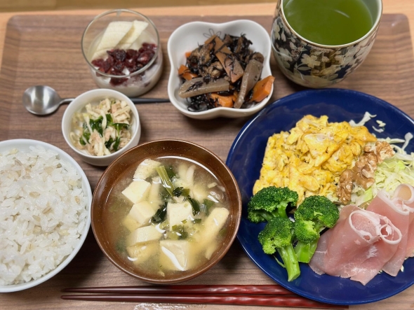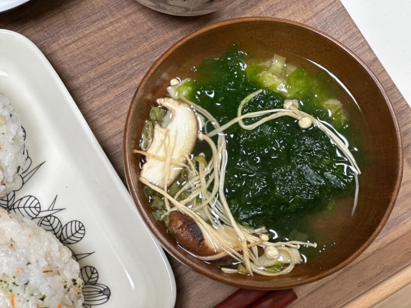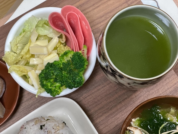 こんにゃくの右側にある白い器には、ブロッコリー、ハム、レタスに小さく切ったチーズを乗せたサラダが。エノキ、シイタケ、生のりが入った具だくさんのみそ汁と濃い緑茶も用意しました。愛情しか感じられません。