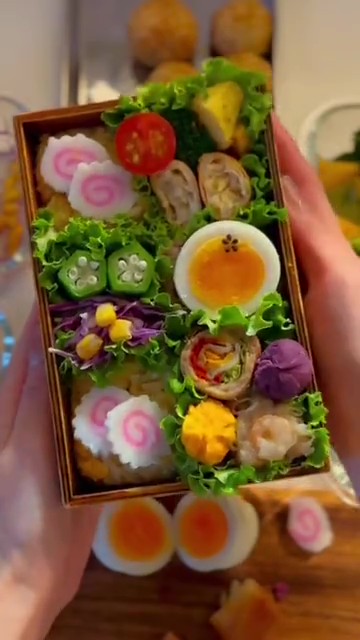 葉野菜をカップ代わりにしたスペースには、サラダのほか、中華らしい春巻きやシューマイなどのおかずがぎっしり。ご飯の上には、なると巻やスライスしたゆで卵が彩りよくトッピングされています。見た目の華やかさとボリュームのバランスが絶妙です。