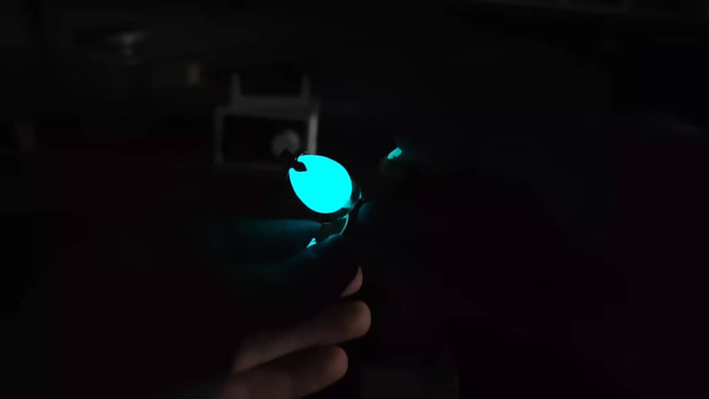 固まった蓄光レジンを支柱に差し込んで、コインで作ったゴールデン・エッグの内部にセット。最後にストッパーを回して中をのぞくと……暗闇の中で幻想的に光る“ゴールデン・エッグ”が完成しました。